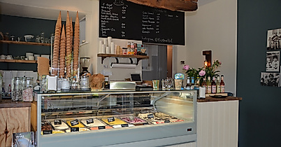 A built-in window gives guests a glimpse into the small ice cream kitchen. Classics such as vanilla, chocolate and stracciatella are freshly filled into the ice cream bowls every day, especially at the weekends, but also more unusual varieties such as goat's milk rosemary honey ice cream, beet raspberry or pear parsley sorbet. The ice-cream makers are happy to take up the wishes and ideas of their guests, balance them out and so new varieties regularly find their way into the ice cream display case.